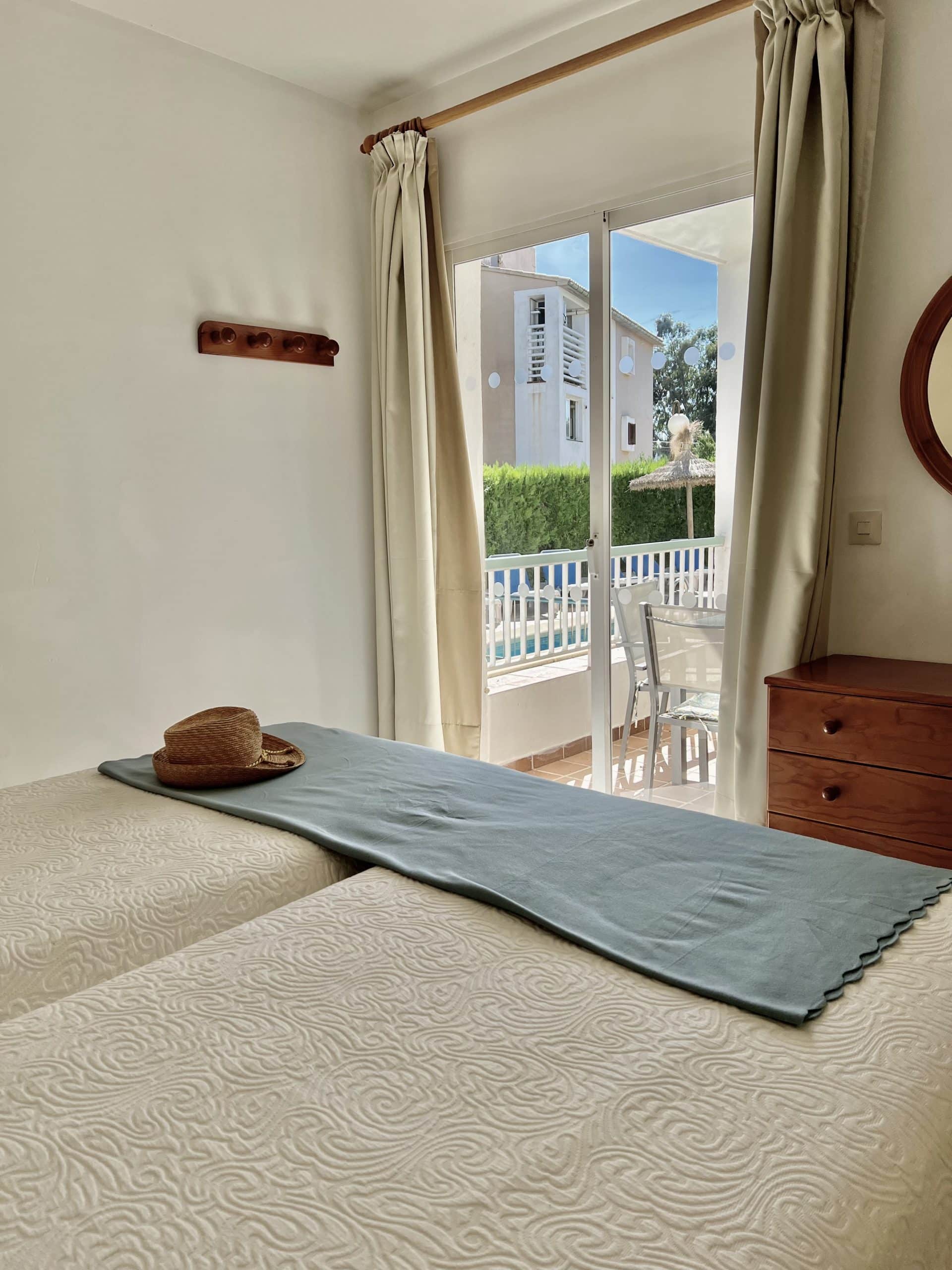 Villa Alexia is a charming, serene and relaxed complex of 10 apartments built around a 13 meters swimming pool. The apartments are five minutes walk to the town square and nine minutes walk to the beach.The swiming pool is L shape and has a separated children’s area 80 cm deep. It’s also surrounded by a sun bathing terrace and has a barbecue to the far right .This is a bright and tasteful Two bedroom apartment 301 that is located on the second floor. It also has views of the mountains and to the side of the pool and sun-bathing terrace. Children at Villa Alexia are most welcomed and happy!. Please keep in mind that for their own comfort we allow up to two children per apartment. The apartment is ideal for 4 guests but can sleep 5.